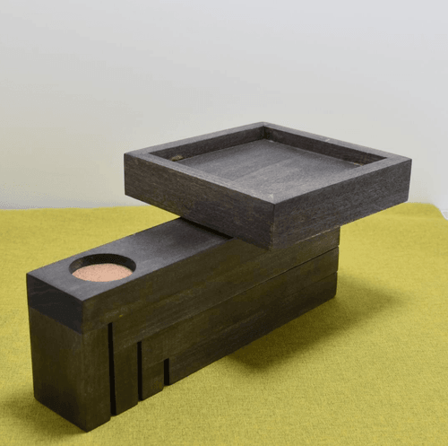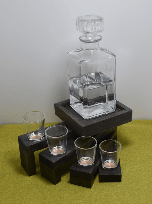 Serve your spirits in style. This handcrafted bourbon flight features four cork lined shot glass slots and a raised center tray—perfect for holding a decanter, garnishes, or that extra splash. Whether you’re hosting or sipping solo, it’s built to impress. Includes 4 shot glasses. (Decanter not included, Click image for additional pictures)